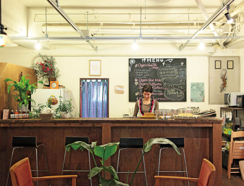 三条寺町スタジオに併設されているヴィーガンカフェ「Cozy Cafe」は、メンバー以外でもふらりと立ち寄れるオープンスペースとなっている。カフェでは京都の食材を使ったヴィーガンマフィンや、玄米おにぎりランチなどの人気メニューが頂ける。「ヨガをしていると身体の変化とともに、普段の食事にも変化が感じられる時があると思います。そんな時に身近にやさしい食事がとれ、気軽に食生活の参考にしていただける場所になればと思います」(小上さん)。