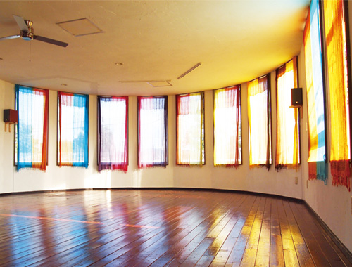 JR駅前という便利な立地にありながらも、一面のガラス窓からは太陽の光が降り注ぎ、遠く阿蘇山も臨むことができるYOGA・YOKA。ヨガレッスンの他にも、ヨガと音楽、ヨガと占いなど、ヨガの垣根を超えるワークショップ開催を通して、ヨガを思う存分に楽しめる場所を作っていきたいという。