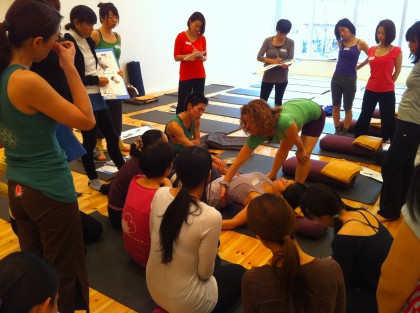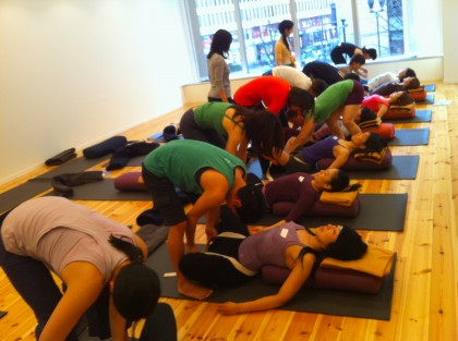 (上)スプタ・ヴィラーサナでのアシスタントのケイコ先生によるアジャストメントデモ。