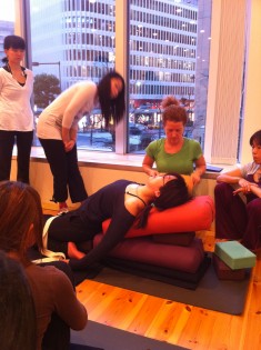 (上)リクライニングポーズで、肝心なのは肋骨をボルスタで支えることで、その下の腎臓など内臓は特段サポートを必要としていません。肋骨はここまでですね?と、ドミニカ先生。