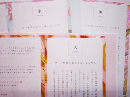 ヴァ―タ(風)、ピッタ(火)、カパ(水)という3つ生命エネルギー(ドーシャ)について、問診票を使って診断。