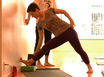 ブロックに足裏の付け根をおくポーズの適応方法は、過伸展で脛骨を押すように前屈しようとする人にはとてもキツイ筈とドミニカ先生。