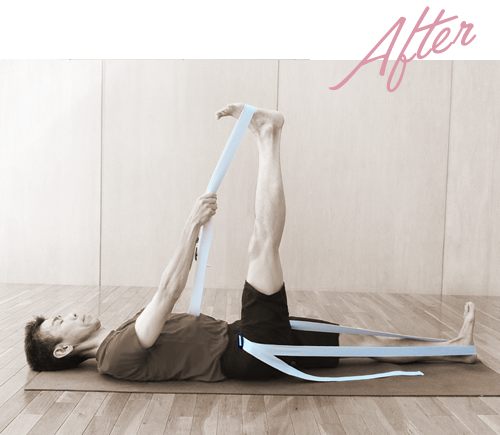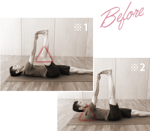 ヨガベルトがあれば、腕、脚の長さや柔軟性によって制限されるようなポーズも、カラダを縮めることなく行えるので無理をせずにポーズの効果を得ることができます。たとえば、スプタ・パダングスターサナの場合、手で足の指をつかもうとして膝が曲がってしまったり(写真※1)頭が持ち上がってしまう(写真※2)ことがありますが、Afterの写真のようにヨガベルトを使って天井に向かってあげた足裏をベルトでサポートすれば、ハムストリングが硬くても、気持ちよく伸ばせることができます。
