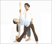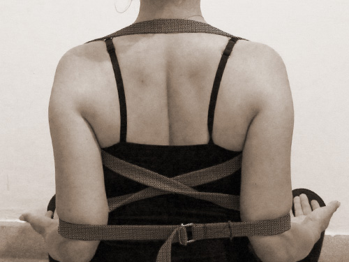 - ヒジを曲げてベルトをしぼることで、肩を後下方向に、胸椎を前方に持ち上げて、上半身を正しい姿勢に矯正することが出来ます。(写真右)