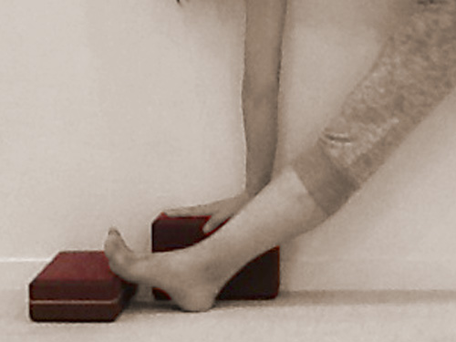 - ヨガマットを壁につけて平行に敷き、ヨガブロック2個 を用意します。