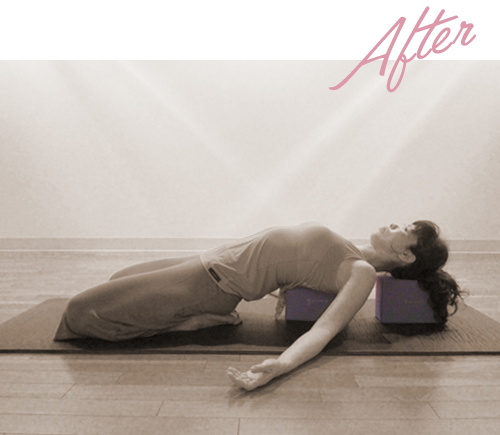 - ゆっくりと手を使いながら、背中と後頭部をブロックの上に休ませます。この時、膝が開いても構いません。
