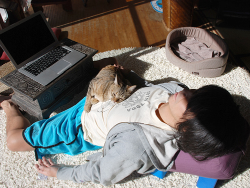 気がつくと人前でもストレッチはじめてしまう体質なので(「猫が嫌がる」と、妻によく怒られます)、家の畳の上ではだいたい、ボルスターかヨガブロックを横においています。ボルスターに腰とか膝のっけてテレビやDVDを観たり、ブロックと組み合わせてリラックスチェアにしたり、今となっては手放せない「おうちグッズ」となってしまいました。