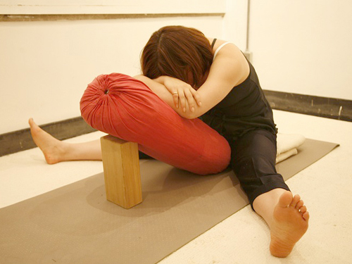 前屈のポーズは身体を緩めて、神経を落ち着かせてくれる優れたポーズです。膝裏、背中(特に中心からお尻までのカーブ)にかけて気持ちよい伸びを感じることができますが、ボルスターに上半身の重みを預けることで、頭の重みが軽減し首や肩の緊張を緩和してくれます。起き上がるときは、深い深呼吸で心地よさを感じましょう。
