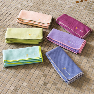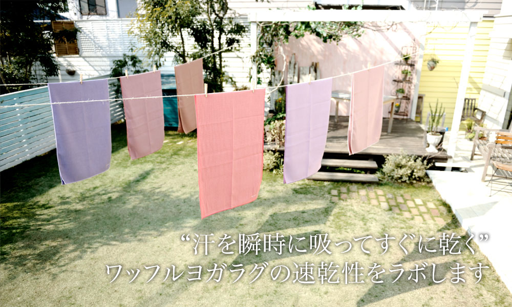 ところが、吸水・速乾性に優れたマイクロファイバー素材のワッルフヨガラグは、従来のヨガラグの半分以下の重量と軽量で、凹凸のあるワッフル織が汗を瞬時にキャッチするので表面はいつもさらっと快適。洗濯後の乾燥も早いので毎日使いも可能です。
