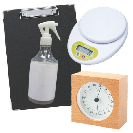 電子測り器(1kgまで計測可能)、湿度計、霧吹き、受けとして使う板