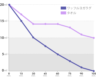 ワッフルヨガラグと一般的なタオルとの乾燥速度の違いは歴然。15分時点では数グラムの差しか見られませんが、30分後でワッフルヨガラグの残留水分量は50%、45分後には37.5%、60分後に25%と乾燥が進むのに対して、タオルの30分後から60分後まで70%の残留水分量が一定、乾燥のスピードが遅いことが分かります。