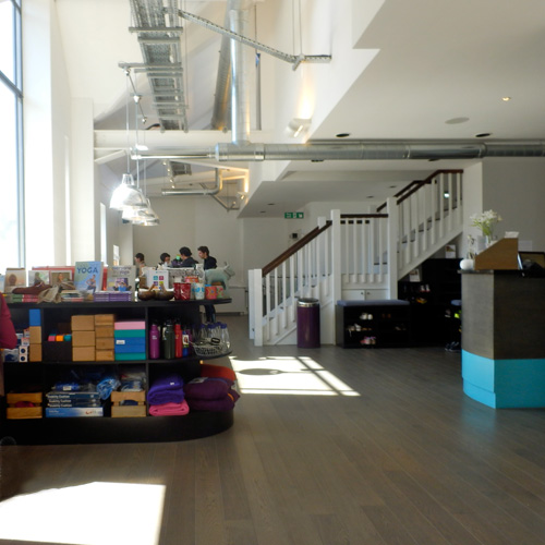 <写真>2000年にオープンしたプリムローズ・ヒルスタジオ。広々としたスタジオではワークショップも開催される。高い天井が心地よい空間にレセプション、オーガニックカフェ、ショップ、トリートメントルームが併設されている。