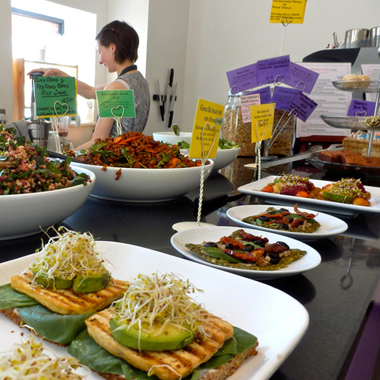 <写真>プリムローズ・ヒルとチェルシーのスタジオに併設されたオーガニックカフェ。ベジタリアン、ビーガン、グルテンフリー、ローフードなどのからだに優しいメニューを、レッスンやトリートメントの余韻に浸りながら楽しみたい。