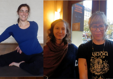 (右)イエローヨガのオーナーの1人、クラウディアさん(Claudia Dietrich、左)。心理学者でもありパフォーマンス教育プログラム スマッシュ・ベルリン にも携わる。インストラクターのヴィクトリアさん(Victoria Larsson、右)はスェーデン出身。ベルリンでは数少ない陰ヨガインストラクターだ。小説家でもある。