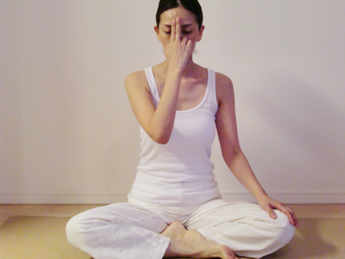 - あぐらで座り、左手を膝の上に。右手の人差し指と中指を眉間に置きます。