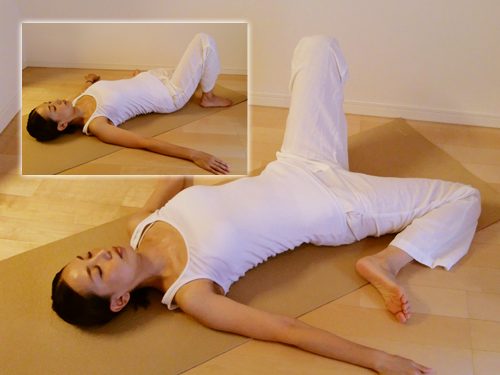 - 息を吐きながら、左の膝を内側に倒し、床に近づけます。(5呼吸キープ)