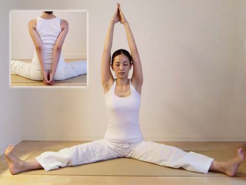 - 両足を開いて開脚。肩の力を抜いて胸の前で合掌します。