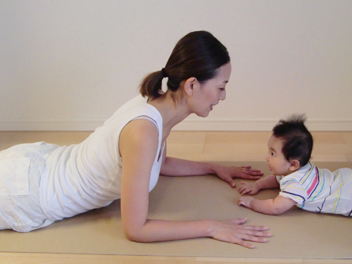 お産の傷が癒えてきたら、徐々に日常生活へとシフトチェンジしていきましょう。産後検診で経過が順調なママンであれば、産後2か月を目安にヨーガ復帰も可能です。24時間体制でベイビーの世話に追われていると「運動よりも、まずは休息!」と嘆きたくなりますが、実は、カラダが本来の状態に戻ろうとしているこの時期に適度な運動を行なえるかどうかは、ボディラインの回復の重要な鍵になります。お勧めしたいのは、育児しながらボディケアもできる「ながらケア」です。特に、育児は前かがみの姿勢で行うことが多いので、背中を優しく反らせる動きが効果的。今回は、気持ちよく後屈させることで背中のコリをほぐし、骨盤底筋の引き締めやヒップアップ効果が期待できる『コブラのポーズ』をご紹介します。母乳トラブルも軽減するという嬉しい効果も期待できます。ベイビーと一緒に楽しみましょう。